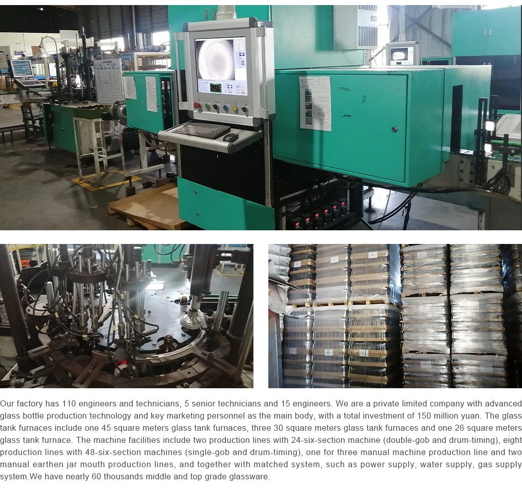 También me gustaría informarle que la botella de vidrio de agua de 500 ml también se puede personalizar a 1000 ml. En realidad, no solo somos profesionales en la tecnología de soplado, sino que también somos buenos en la prensa y el soplado. Significa que también nos estamos enfocando en la botella de gran volumen que supera los 1000 ml.